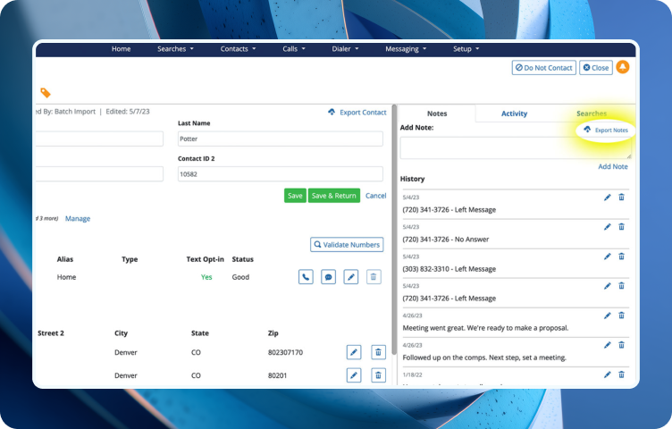 If you’re using Batch Search to append good data to your list and enriching your contacts with current information, your BellesLink contact records may be your most up-to-date. You can share the information inside an individual contact record with your other business systems. An export of a contact record will include name, contact IDs, and tags, phone numbers with opt-ins, alias, types and status, addresses, emails, and custom fields.