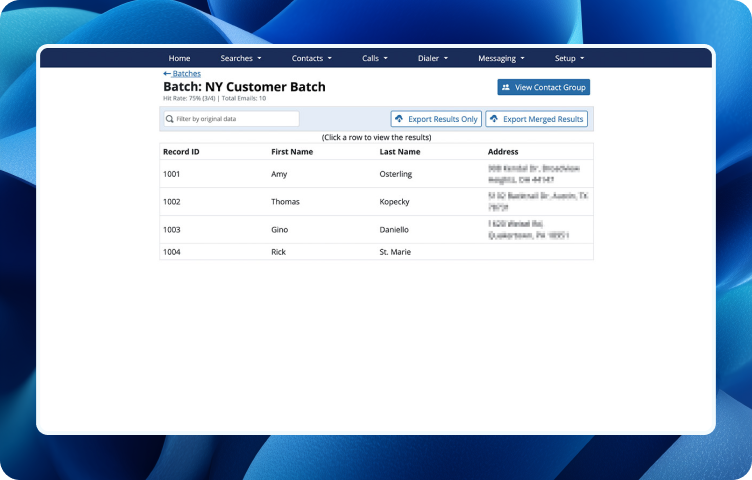 Batch Search appends current phone numbers, addresses, and emails to your list. Import your batch search results into the Contact Manager as a contact group to immediately begin working with them. All the names, phone numbers, addresses, and emails in your search results are neatly organized into individual contact records that will link all your work together. There’s no faster way to go from data to contact.